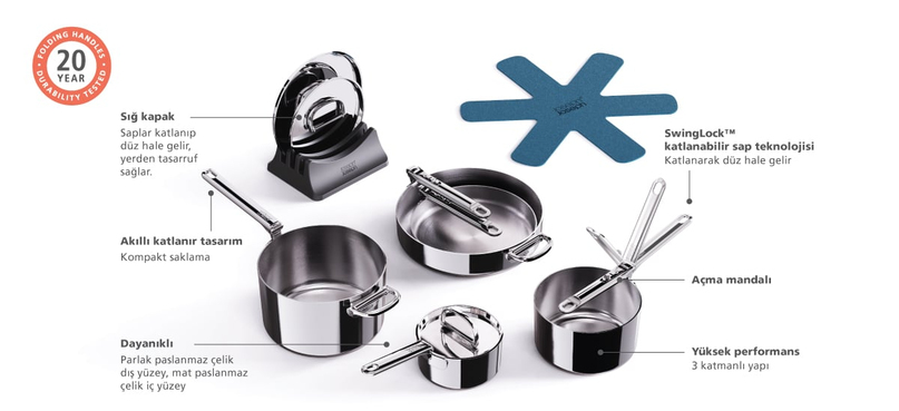 Joseph Joseph Space Serisi Profesyonel 12 Parça Set, mutfak depolamasını maksimuma çıkarırken profesyonel pişirme performansı sunar. İstiflenebilir (nesting) tasarım ve katlanabilir paslanmaz çelik saplar sayesinde saklama ihtiyacını %50’ye kadar azaltır. 3 katmanlı (3-ply) paslanmaz çelik gövde, eşit ısı yayan alüminyum çekirdekle güçlendirilmiştir; böylece homojen pişirme ve üstün dayanıklılık elde edilir.